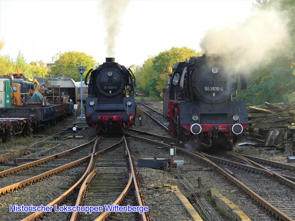 Die beiden Dampfloks 50 3570 und 35 1097 haben sich im Oktober 2019, zu unserem Herbstfest auf diesem Bild getroffen.