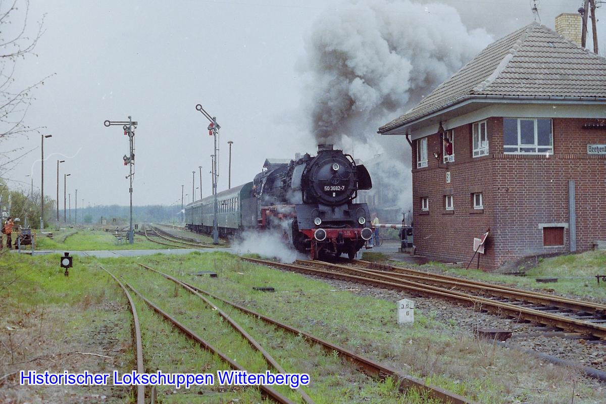 Am 17.5.1997 war unsere Dampflok 50 3682 beim Bahnhofsfest der Prignitzer Eisenbahn in Pritzwalk zu Gast. Das Foto wurde vom Stellwerk in Pritzwalk aufgenommen. Im Hintergrund erkennt man den Bahnhof von Pritzwalk.