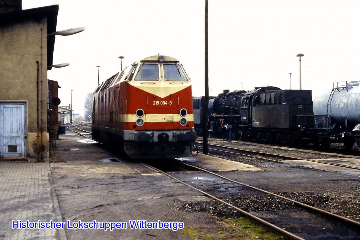 Am 29.12.1994 stand 219 004 der Deutschen Bahn AG im Bahnbetriebswerk Salzwedel bereit, um Personenzüge auf den Strecken in der Altmark zu befördern. Die Dampfloks der Dampflokfreunde Salzwedel (rechts im Bild) waren knapp zwei Jahre zuvor vom Schrottplatz in Meyenburg nach Salzwedel überführt worden und warteten auf ihre Aufarbeitung.