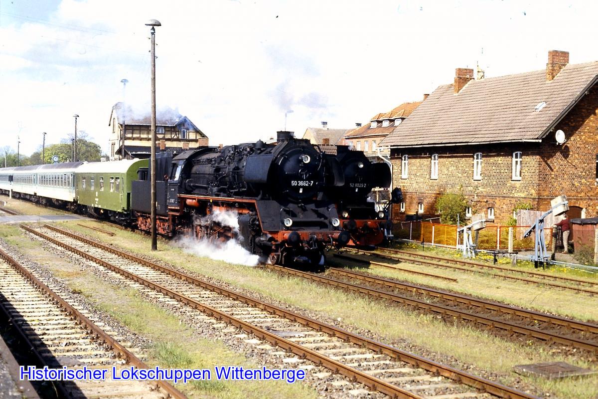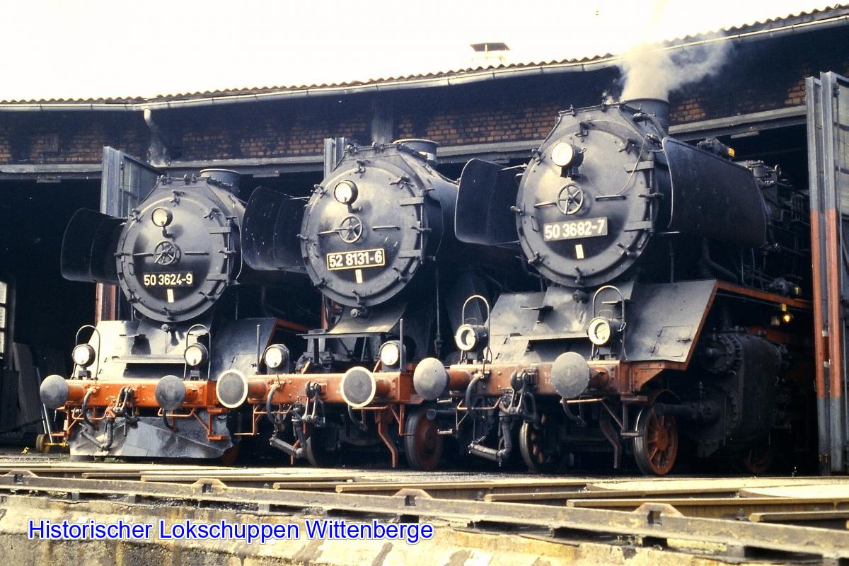 Am 30.4.2000 sonnten sich drei unserer Exponate vor dem Lokschuppen in Salzwedel. 52 8131 hat uns inzwischen verlassen und gehörte zeitweise der Firma WFL Wedler Franz Logistik GmbH, welche die Lok inzwischen betriebsfähig aufgebaut hatte. Im Jahre 2020 wurde die Lok an den Lausitzer Dampflokclub verkauft. Die anderen beiden Loks, 50 3624 und 3682 gehören nach wie vor zur Sammlung in Wittenberge.