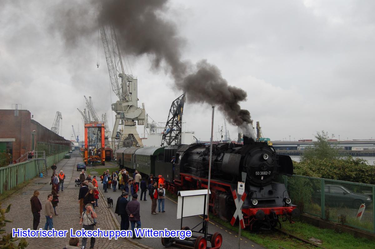 Am 28.9.2007 bespannten wir Rundfahrten durch den Hamburger Hafen mit unserer Dampflok 50 3682. Die Fahrten begannen und endeten am Bahnhof Hamburg-Harburg. Ein Halt wurde immer bei Hafenmuseum eingelegt, wo der Zug auf dem folgenden Bild abgebildet ist.