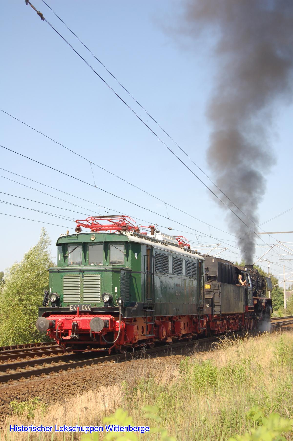 Anfang Juni 2008 wurde in Salzwedel das Hansefest gefeiert. Grund genug für uns, auch einige Gastfahrzeuge nach Salzwedel einzuladen. Hier sehen wir, wie gerade die Elektrolokomotive E44 044 aus Dessau von unserer Dampflok 50 3682 in unser Museum geschleppt wird.