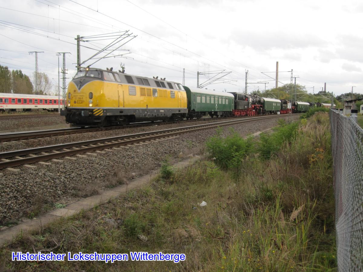 Der 13.10.2012 war sicher einer der bedeutendsten Tage in der Geschichte unseres Vereins. Wir überführten einige unserer großen Dampfloks von Salzwedel über Stendal nach Wittenberge. Das folgende Bild zeigt den Zug bestehend aus einigen unserer Dampfloks der Baureihen 50. Dazwischen sind die Wagen des sogenannten Katastrophenzugs eingereiht, die für die nötige Bremswirkung des Zuges sorgten. Zuglok war die 221 106 der Eisenbahngesellschaft Potsdam, die inzwischen verkauft wurde.