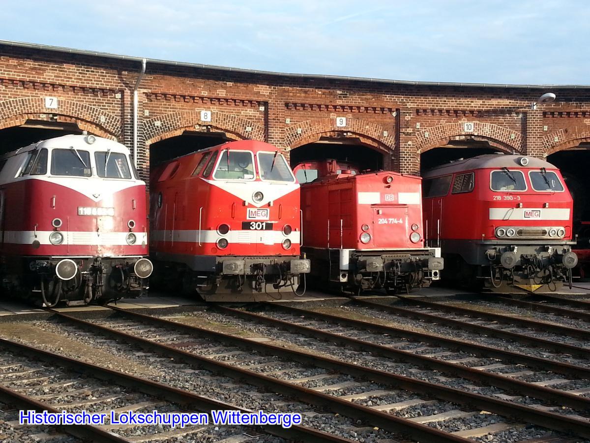 Anlässlich unserer Veranstaltung Herbstdampf 2014 versammelten sich auch mehrere Dieselloks verschiedener Gattungen im Historischen Lokschuppen Wittenberge. Auf dem Bild sind von links nach rechts unsere Diesellok 118 692, die MEG-Lok 301 der Baureihe 119, die Diesellok 204 774 (inzwischen unser Eigentum) und eine Diesellok der Baureihe 218 der MEG zu sehen.
