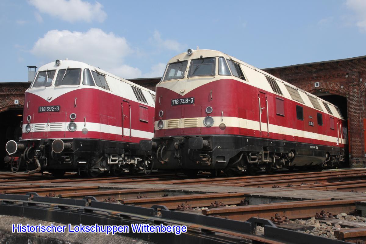 Dampflokfreunde können sich auch über Dieselloks freuen. So erfreuten wir uns am 12.5.2018 an unseren beiden Dieselloks der Baureihe 118, die sich vor dem Lokschuppen sonnten.