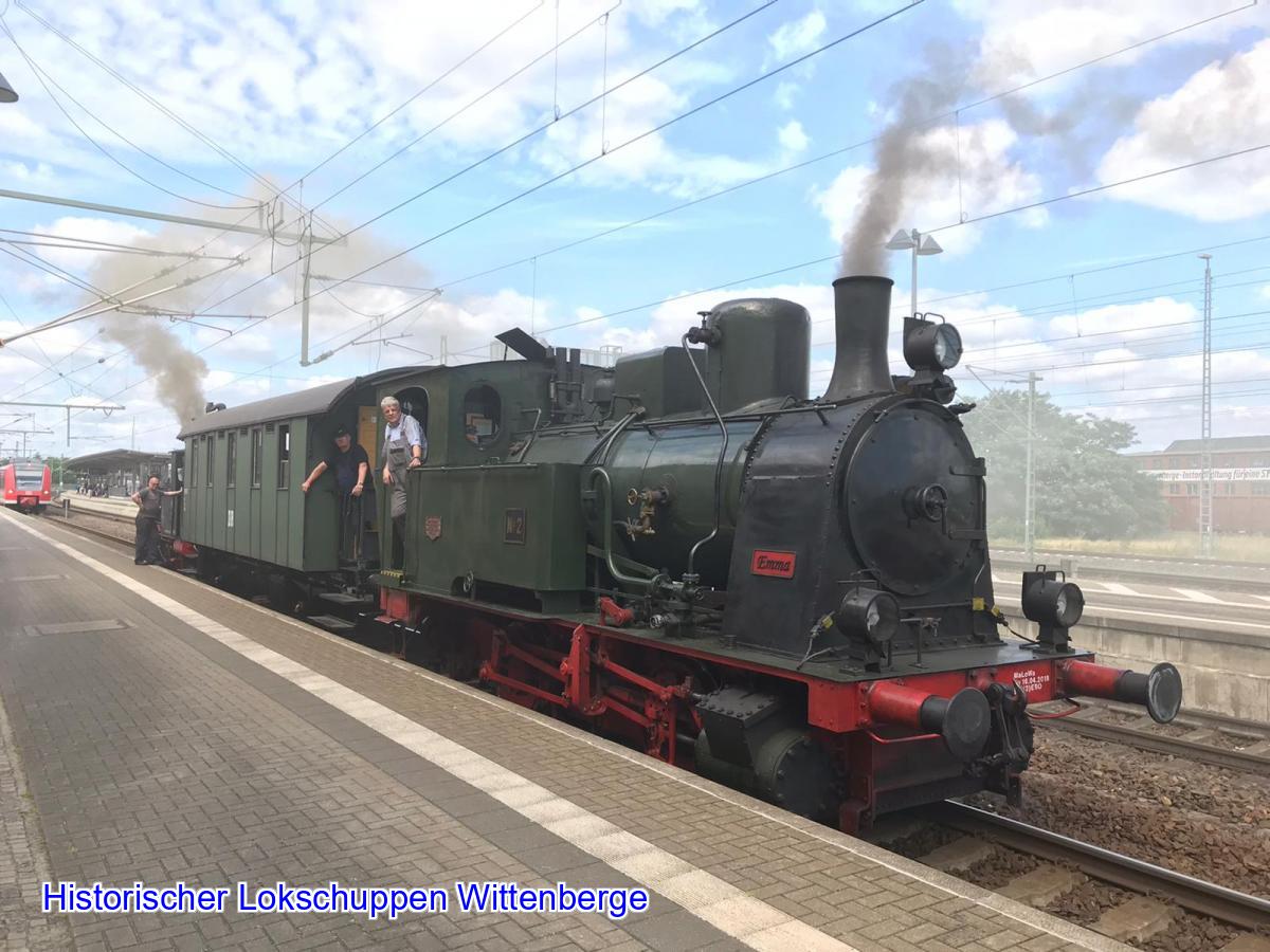 Auch unsere Dampflok Emma und die Lok Pritzwalk der Eisenbahngesellschaft Potsdam durften mal das Museumsgelände verlassen, um einen Sonderzug durch den Wittenberger Hafen zu bespannen. Am 3.7.2021 steht unser kleiner Sonderzug am Bahnsteig im Hauptbahnhof Wittenberge.