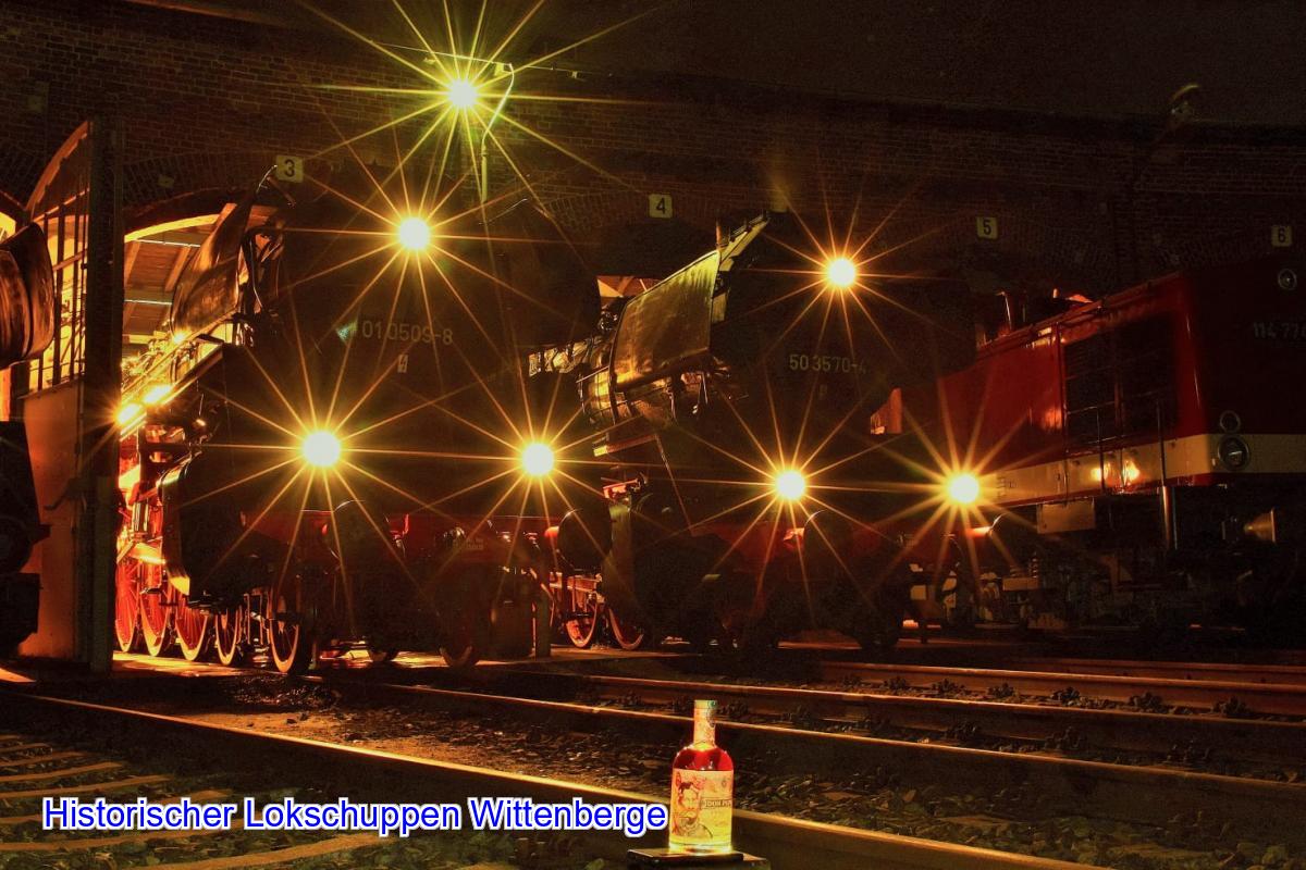 Die Nachtruhe am 9.5.2023 nutzten wir, um eine stimmungsvolle Nachtaufnahme von den Dampfloks 01 509 und 50 3570 vor unserem Lokschuppen aufzunehmen.