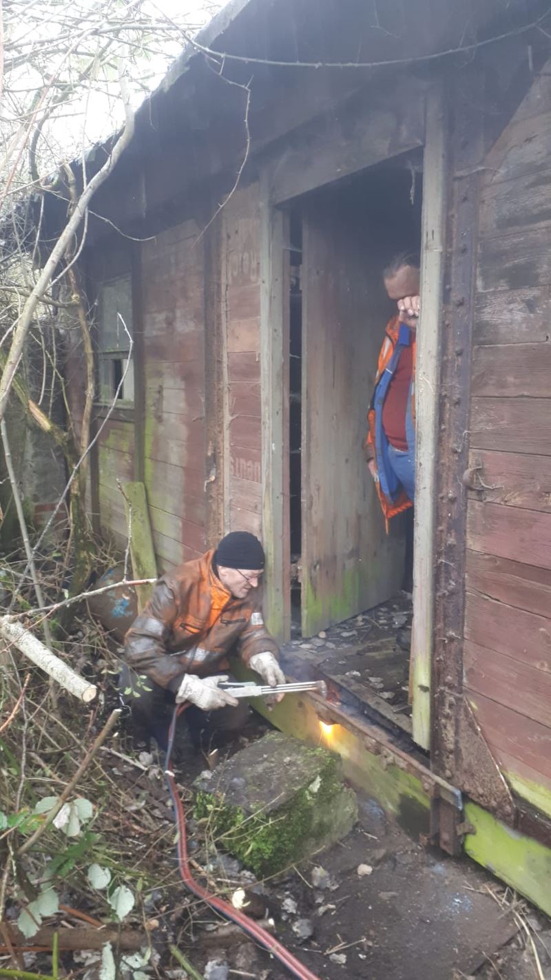 Ebenfalls am Samstag, den 1.2. konnten ein paar wichtige Ersatzteile für unseren Güterwagen gewonnen werden, der sich gerade in Aufarbeitung befindet. Da er im Laufe der Zeit eine seitliche Schiebetür eingebüßt hatte, waren wir auf der Suche nach Ersatz. Fündig wurden wir auf der anderen Elbeseite. Dort steht – inzwischen völlig zugewuchert und verlassen – ein Wagenkasten eines Güterwagens mit ähnlichen Dimensionen wie unserer. Der verfügte noch über eine Schiebetür und entsprechende Schienen und Beschläge. Jedenfalls bis letzten Samstag …