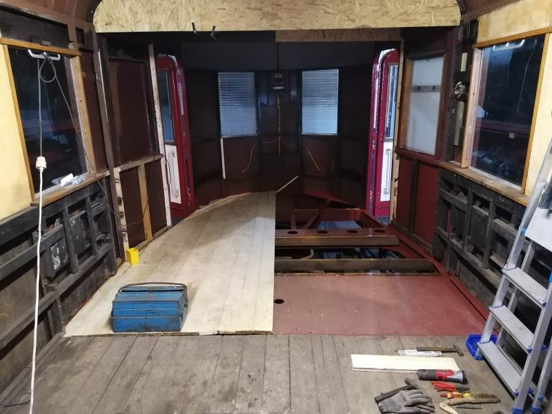 Holzarbeiten werden auch in unserem Beiwagen VB 197 805 durchgeführt. Nachdem der Korrosionsschutz am Rahmen des Fahrzeugs aufgetragen wurde, erhält er nun einen hölzernen Fußboden. Danach können die Innenwände und die Toilette wieder eingebaut werden. Schließlich wird Linoleum als Fußbodenbelag eingebaut.
