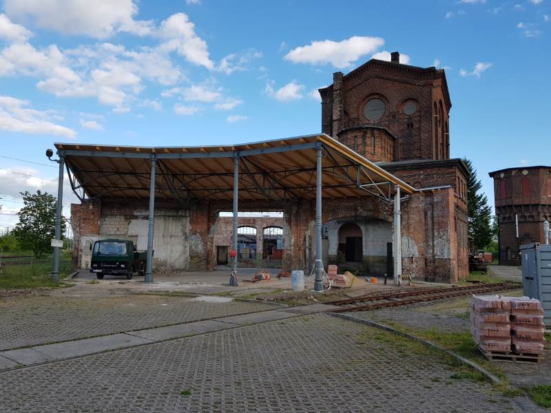 Ende der vergangenen Woche konnte die Dachsanierung des Fragmentes des Lokschuppens 1 abgeschlossen werden. Alle Gerüste sind nun abgebaut und auch alle Maurerarbeiten abgeschlossen. Langsam kann man sich die Dimensionen des ehemaligen Lokschuppens vorstellen, wenn man bedenkt, dass sich das nun gut erkennbare Dachstück in einem vollständigen Kreis fortsetzte und die Mitte dieses Kreises auch noch überdacht war.