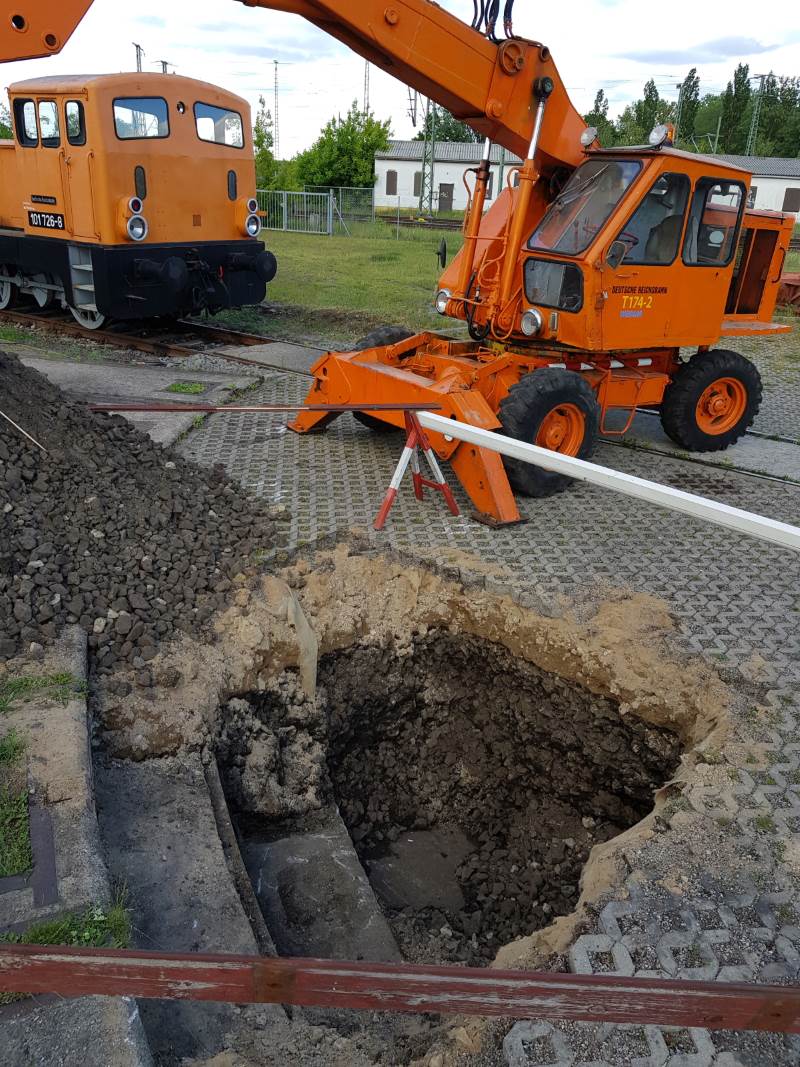 Da angestrebt wird, dass der Lokschuppen 1 eines Tages soweit möglich wieder errichtet wird und auch eine Drehscheibe und entsprechende Schuppengleise eingebaut werden sollen, werden dafür nun die Vorarbeiten durchgeführt. So konnten sich die Kollegen am Samstag archäologisch betätigen und einen Teil der noch vorhandenen, aber derzeit zugeschütteten Drehscheibengrube freigelegen, damit das Profil der Grubenwand gemessen und der Erhaltungszustand geprüft werden kann. In Kürze wird die notwendige Statik neu berechnet.