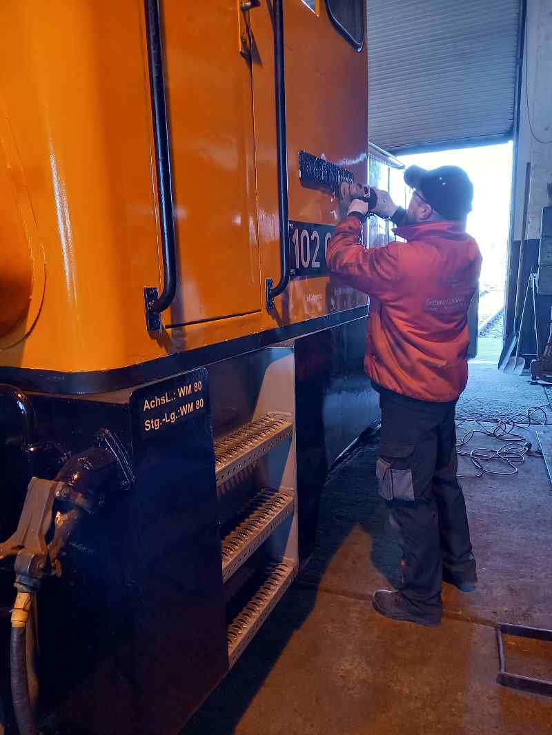 Da sich der Beginn der Museumssaison nähert, haben sie die Aktiven am Samstag wieder angestrengt, um die Aufarbeitung von Fahrzeugen voranzubringen oder abzuschließen. So konnte die Diesellok 102 076 heute fertig gestellt werden. Zum krönenden Abschluss der Neulackierung wurden die Lokschilder angebracht.