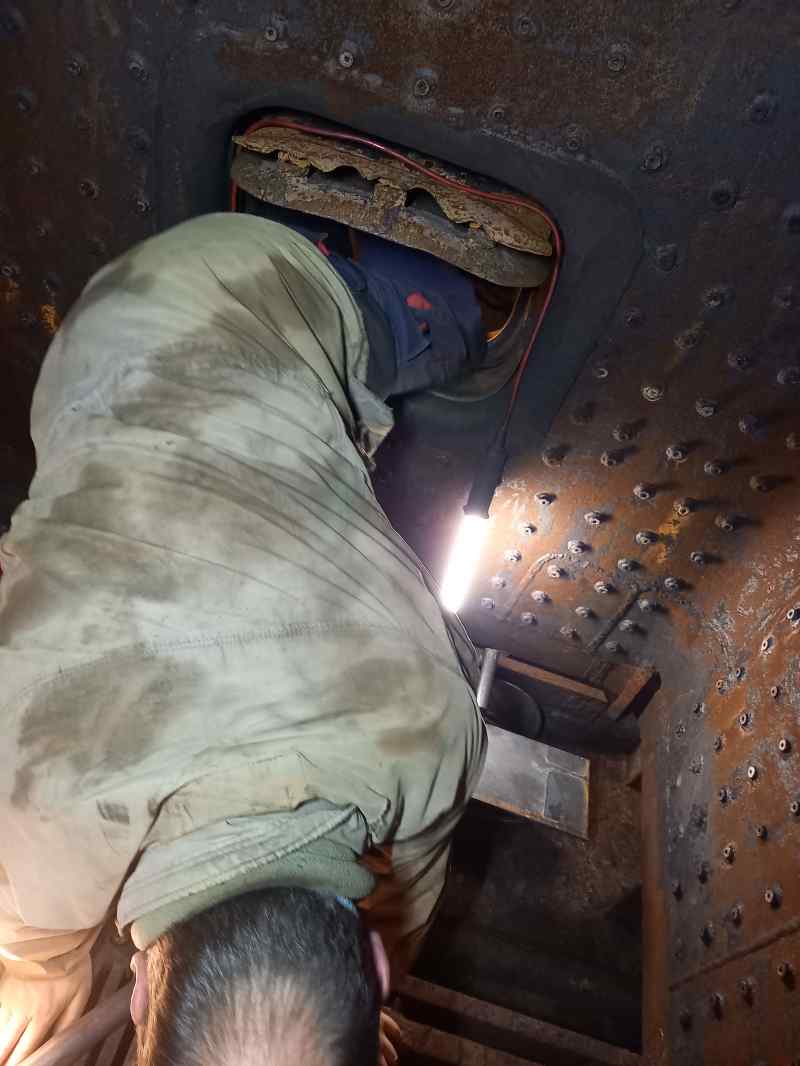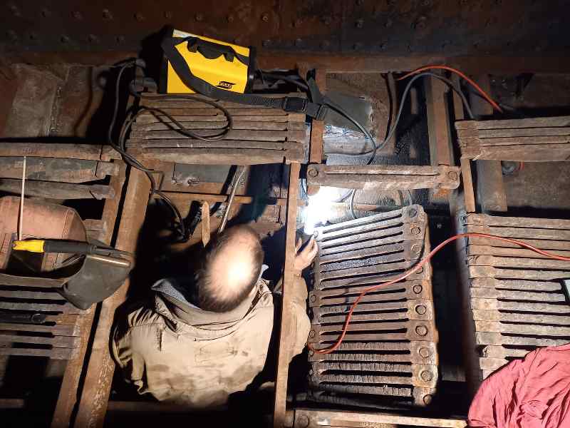 Weitere Arbeiten wurden heute auch im Aschkasten der Dampflok 50 3570 durchgeführt. Hier wurden neue Bleche eingeschweißt. Leider ist der Zugang etwas beschwerlich, wie man auf den folgenden Bildern sieht. Die Kollegen mussten durch die schmale Feuertür in die Feuerbüchse klettern, um den Aschkasten von innen zu erreichen.