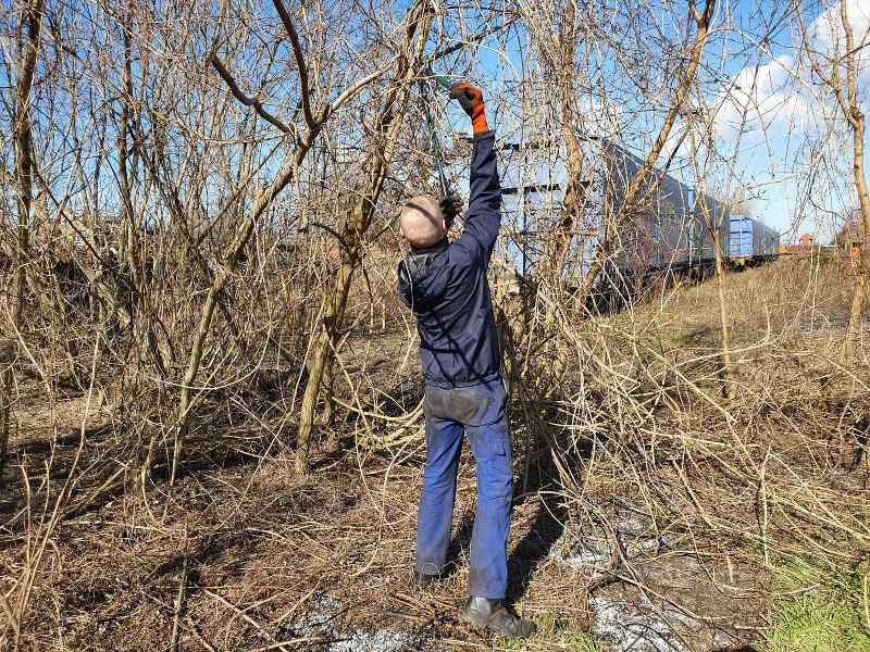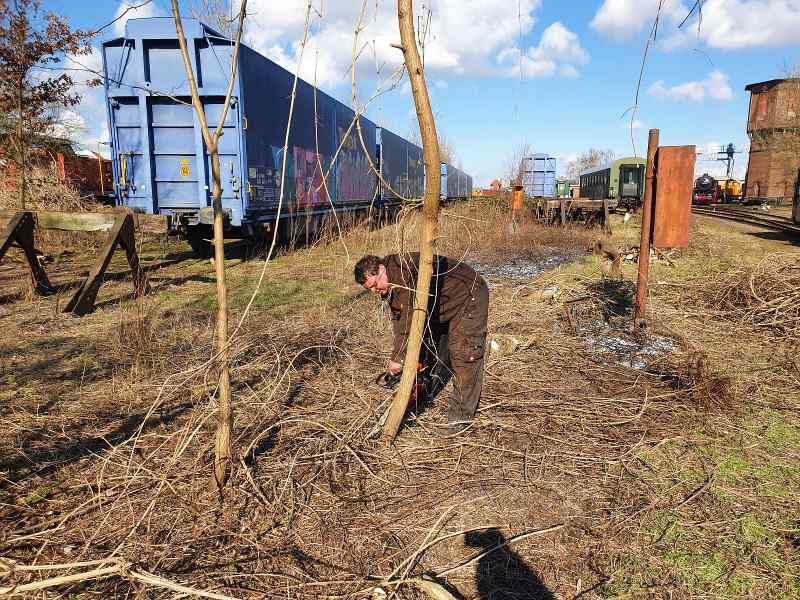 Und da das Wetter schön war, konnten sich einige Aktive um den Bewuchs im Gelände kümmern. Hier wurden einige Büsche zurückgeschnitten, welche die Sicht in den Gleisbereich einschränkten.