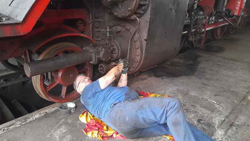 Außerdem wurden die Überdruckventile an den Dampfzylindern abgenommen und gereinigt. Sie dienen insbesondere dazu, im Notfall Wasserrückstände in den Dampfzylindern ins Freie zu entlassen. Das Wasser kann sich insbesondere dann in den Dampfzylindern bilden, wenn die Zylinderwände vor dem Losfahren der Lokomotive noch kalt sind und Dampf in die Zylinder geleitet wird, der dann teilweise an der kalten Oberfläche kondensiert. Wie Sie sich aus dem Physikunterricht in der Schule erinnern, lässt sich Wasser nicht komprimieren. Wenn sich nun Kondenswasser im Kolben sammelt, kann dessen Druck durch die Kolbenbewegung so stark steigen, dass die Wand der Dampfzylinder oder die Zylinderköpfe gesprengt werden. Um das zu verhindern, öffnen sich die Sicherheitsventile der Zylinder bei einem bestimmten Druck.