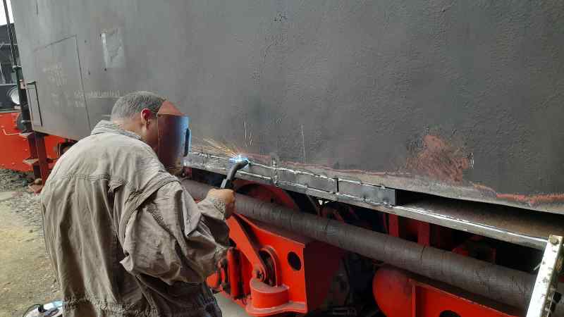 Auch an unserem Dauerpatienten, dem zukünftigen Tender 50 3570 wurde wieder geschweißt. Es hatte sich nämlich herausgestellt, dass die Außenwände des Wasserkastens durch Korrosion erheblich an Wandstärke verloren hatten. Die betroffenen Bereiche oberhalb des Bodens wurden ausgeschnitten und neue Bleche eingeschweißt.