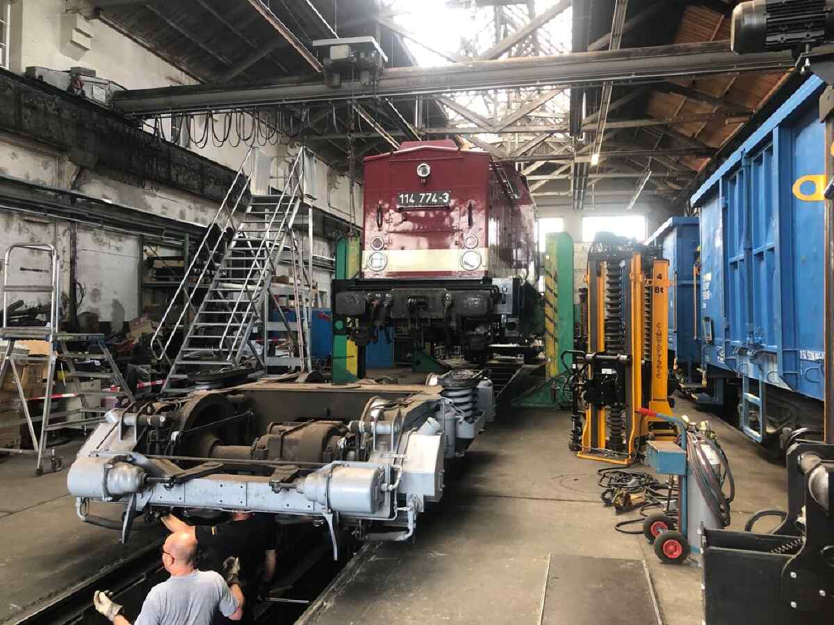 Heute ein kleiner Sonderbericht über die Fahrwerksuntersuchung an unserer Diesellok der Baureihe V100, die die Betriebsnummer 114 774-3 trägt. Wie bereits im letzten Newsletter berichtet, erhält die Lok nun diese Untersuchung, um freizügig auf dem Schienennetz in Deutschland verkehren zu dürfen. Dazu ist das Fahrwerk der Lok zu prüfen und gegebenenfalls instandzusetzen.
