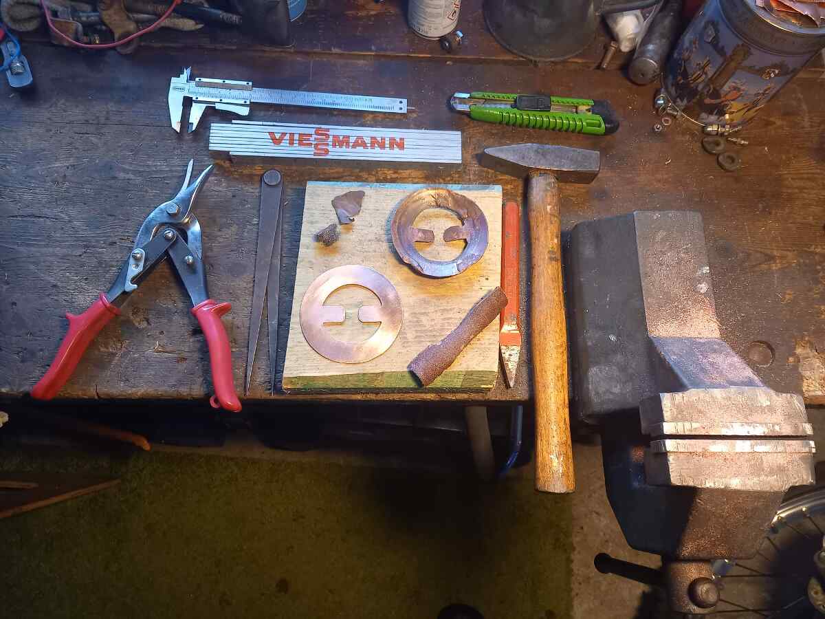 Erwähnenswert ist auch noch die fleißige Heimarbeit eines Kollegen. Er hat neue Dichtungen für die Kesselspeiseventile der Dampflok Pritzwalk in Heimarbeit hergestellt. Hier ein Bild einer alten und neuen Kupferdichtung und seiner Werkzeuge zur Herstellung.