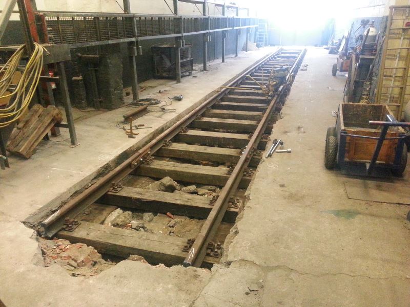 Auch die Gleisbaustelle im Lokschuppen macht Fortschritte: Inzwischen wurden Schwellen und Schienen verlegt. Nun fehlt im Wesentlichen noch die Betonabdeckung des Zwischenraums zwischen den Schienen bzw. am Rand zwischen den Schienen und dem bereits vorhandenen Fußboden.
