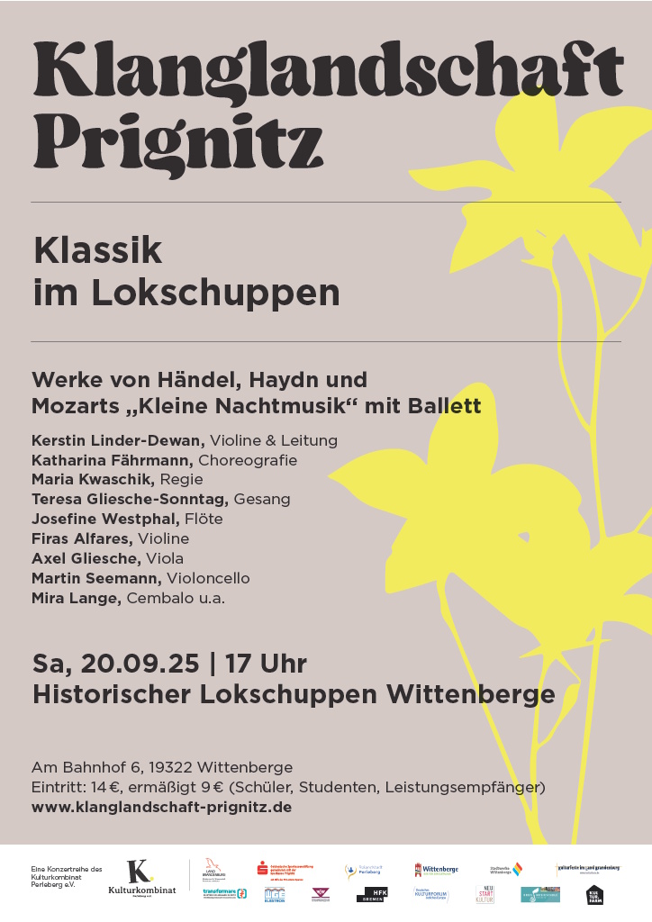 Ab 17 Uhr findet ein Konzert im Lokschuppen statt, das Ihnen klassische Musik in Form von Werken von Händel, Haydn und Mozart kredenzt. Zum ersten Mal wird in diesem Rahmen die besondere Kulisse des Lokschuppens auch für einen Programmbeitrag der Ballettgruppe der Kreismusikschule genutzt. Der Eintritt für das Konzert kostet 14 Euro, ermäßigt 9 Euro (Schüler, Studenten, Leistungsempfänger). Nähere Informationen finden Sie auch unter https://www.klanglandschaft-prignitz.de .