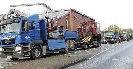 Im Konvoi raus aus der Stadt: Die Lokomotiven fuhren auf Tiefladern in ihre neue Heimat nach Wittenberge.