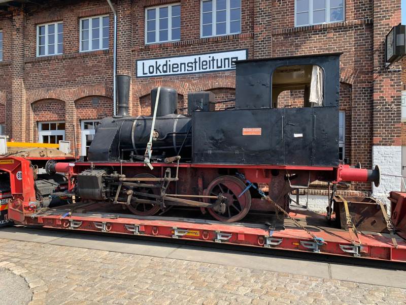 Die folgenden Bilder zeigen die Lok noch auf dem Spezial-Tieflader und nach dem Abladen im Schlepp einer Diesellok auf der Drehscheibe des Museums.
